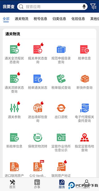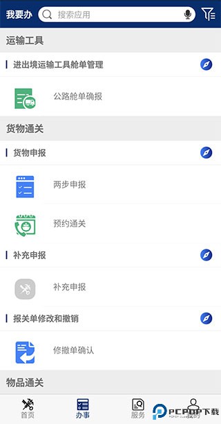 2、【办事】页面为用户提供了各种各样的事项办理业务,例如运输工具类、货物通关类、物品通关类等。