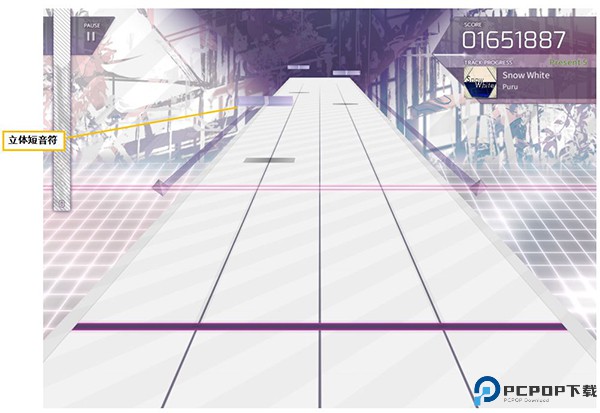 游戏有上、下两条判定线。扁平短音符需要在与下方的判定线重合时点击