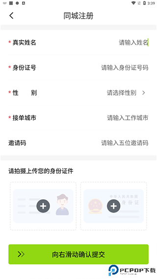 2、按要求填写姓名、证件号码、性别、接单城市,再拍摄上传身份证进行提交,审核通过即可进行接单。