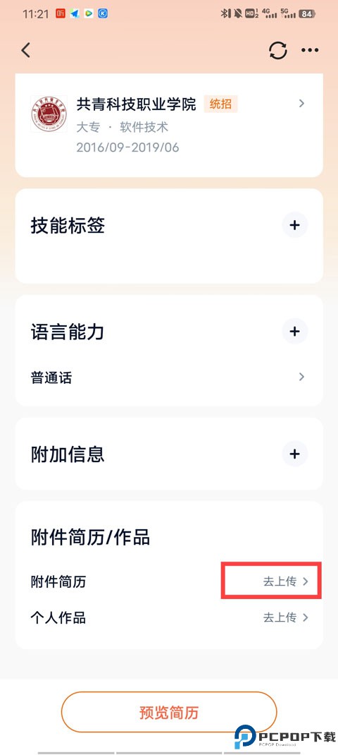 2、浏览自己的简历,然后往下拉,我们可以看附件简历/作品,我们在附件简历中点击去上传;