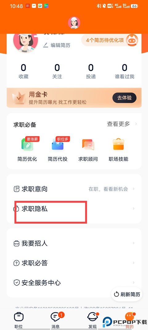 3、在简历隐私设置中,我们可以看到对企业和猎头隐藏简历,我们选择打开隐藏简历;