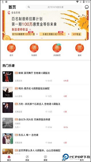 在首页有热门乐谱,还有以歌手、制谱师和论坛为代表的查找和交流功能,其次置顶位置处,还有搜索功能。