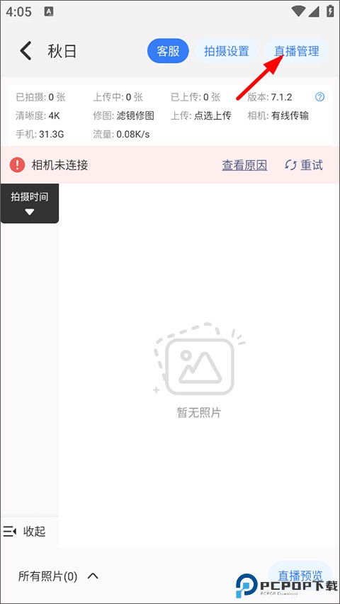 3、进入照片直播页面,当前页面中是没有图片的,用户可以进行拍摄设置和直播管理,点击直播管理;