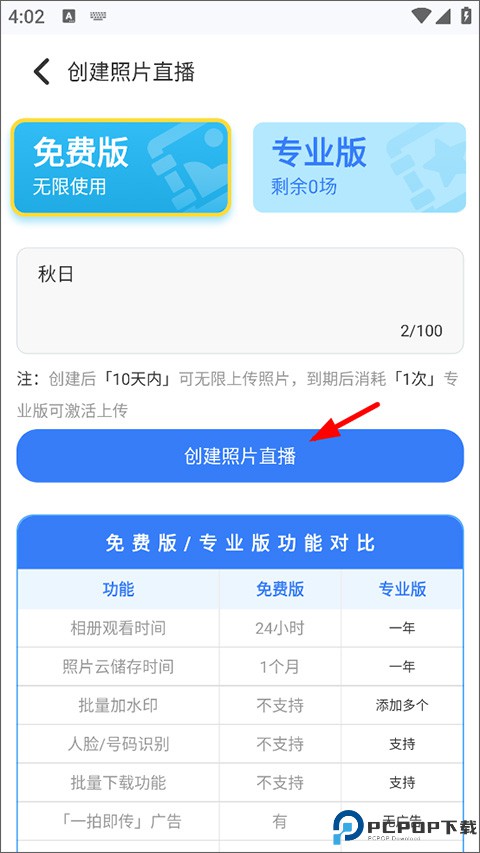 2、打开创建页面,用户可选择免费版或者专业版功能进行创建,输入照片直播标题,点击创建;