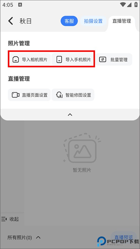 4、打开直播管理,用户选择导入相机照片或者手机照片;