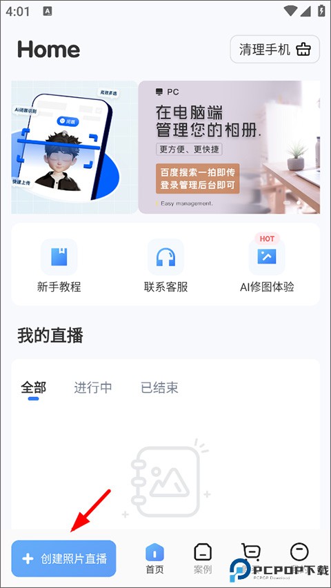 1、新用户需要注册账号才能登录,登录后进入首页,用户在首页可以先了解新手教程再操作,点击左下角的创建照片直播;