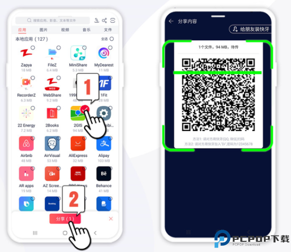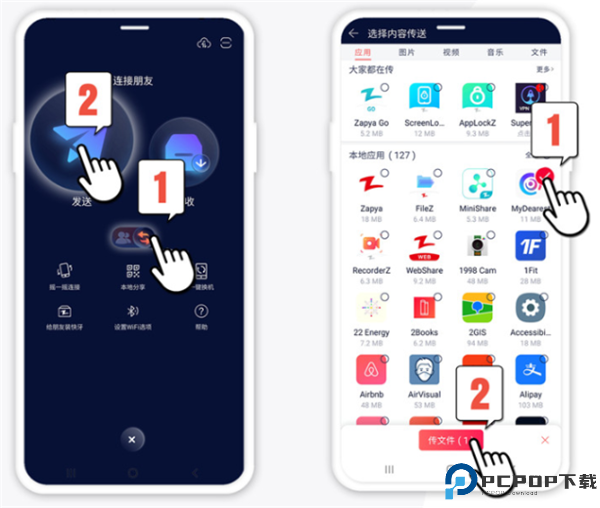 5、这样就和朋友的快牙连接成功了哦,然后是选择你需要传输的文件了,第一步是找到如箭头1所示的那个图标,然后往下翻找到“本地应用”,这样就能给朋友传输自己的软件了,接着只要选择你需要传输的软件就可以了哦;
