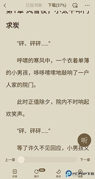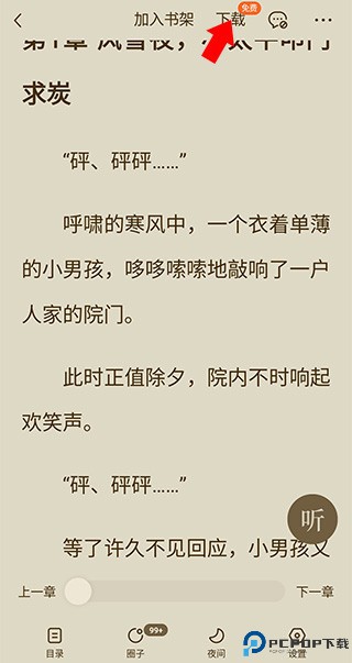 1、选择想要下载的小说后,来到小说阅读界面,点击小说正中间区域即可弹出菜单;