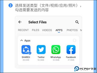 2、选择发送类型(文件/视频/应用/照片),勾选需要发送的内容
