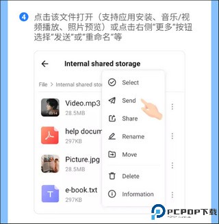 4、点击该文件打开(支持应用安装、音乐/视频播放、照片预览)或点击右侧“更多"按钮选择“发送"或“重命名"等