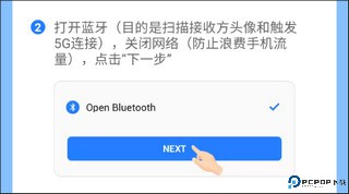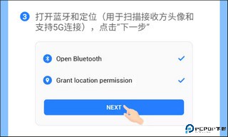 3、打开蓝牙和定位(用于扫描接收方头像和支持5G连接),点击“下—步”