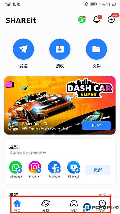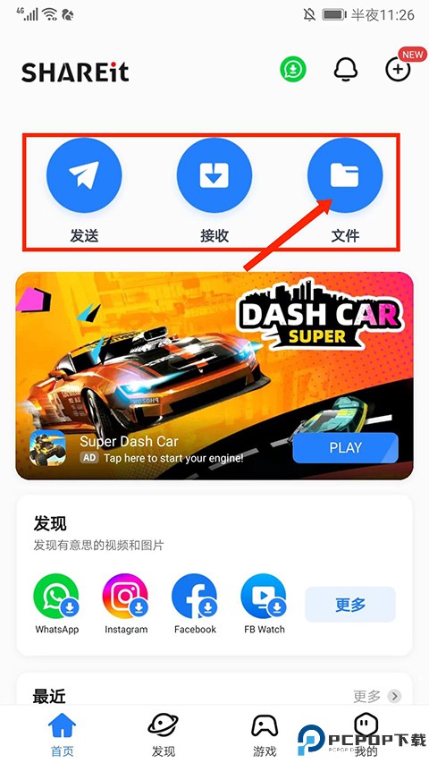 1、打开茄子快传官方正版,进入应用主界面,包括首页、发现、游戏和我的四大栏目,