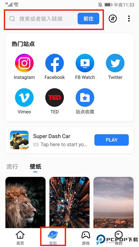 5、在发现界面,包括一些热门的站点和精选的壁纸推荐,用户可以在左上方的搜索框进行搜索或者输入链接,
