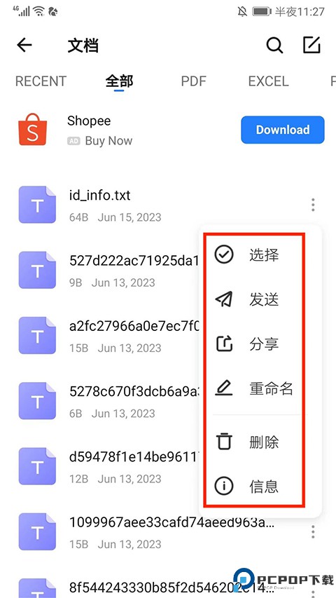 3、进入文件界面,可看到上方已经将手机中的所有文件分为音乐、应用、视频、图片、文档等类别,选择相应的文件可进行选择、发送、分享、重命名、删除、详情等操作,