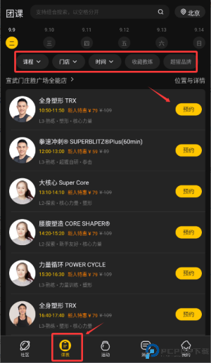 2、进入主界面点击课表功能,可按课程类型或门店筛选合适内容。