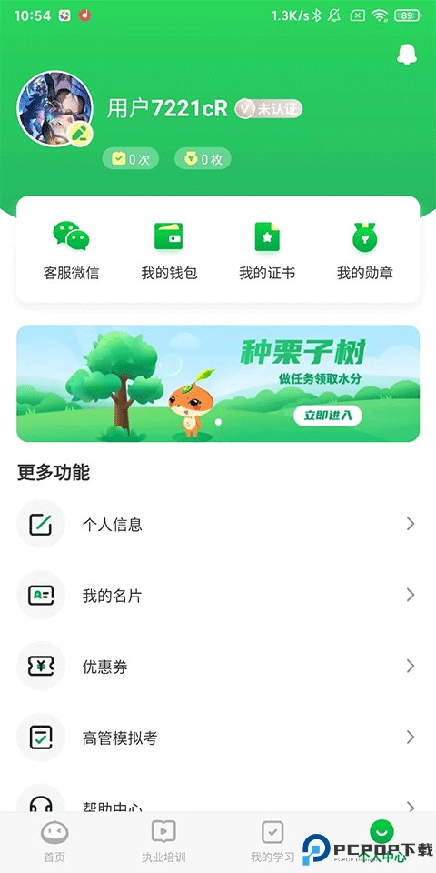 4、个人中心:我的钱包、证书、勋章,还有个人信息、我的名片、优惠券、高管模拟考等更多功能。