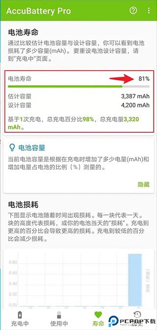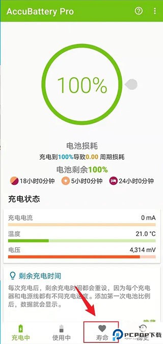 3、等待手机充电到100%后,点击底部菜单中的“寿命”。