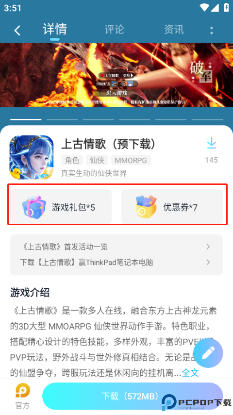2、击进入游戏详情页后,可以看到“游戏礼包”和“优惠券”两个选项。