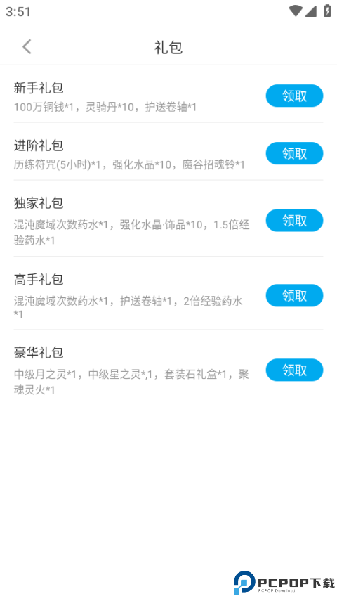 3、在“游戏礼包”界面中,有5个大礼包可供领取,助力游戏开局。