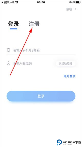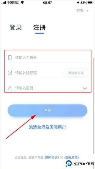 2、点击注册,输入手机号码和密码,获取验证码后完成注册。