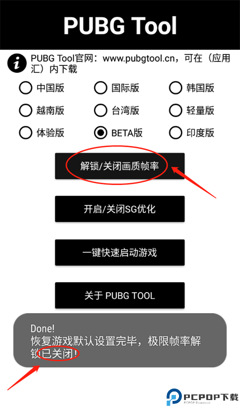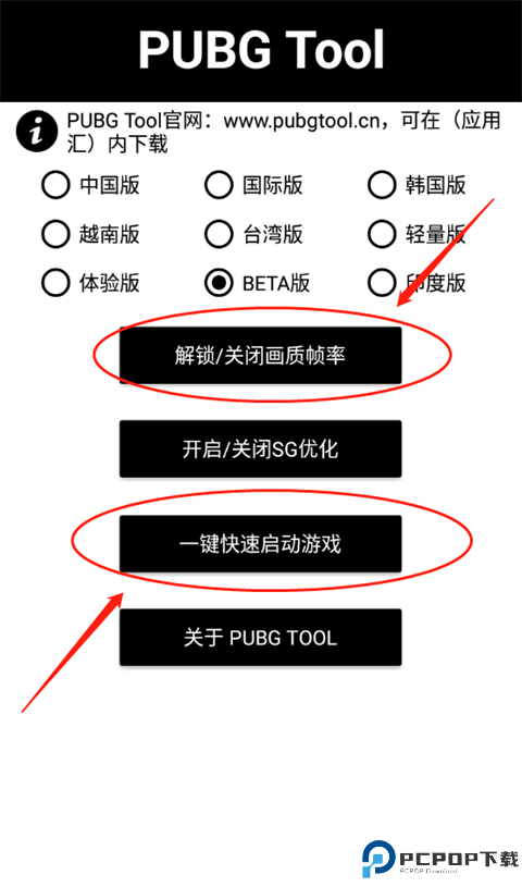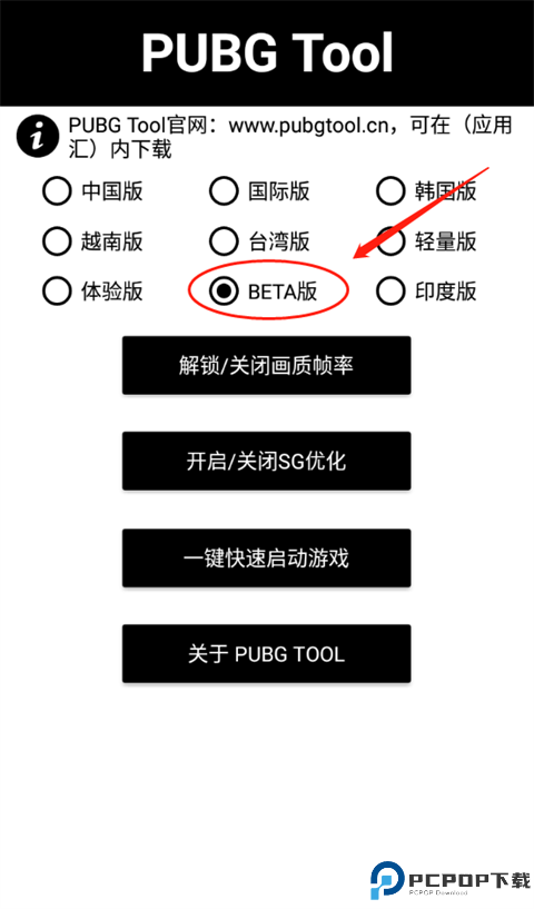 2、进入PUBGTool主界面,选择相对于的PUBG版本(PUBG国际服体验服所对于的是BETA版);