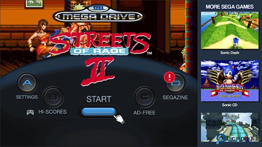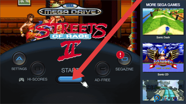 1、进入游戏界面,点击【START】按钮(红箭头指向),启动《Streets of RageII》,进入游戏模式选择。