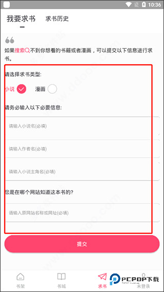 4、而且当你找不到你想看的小说或漫画还能在线对其进行求书,十分强大;