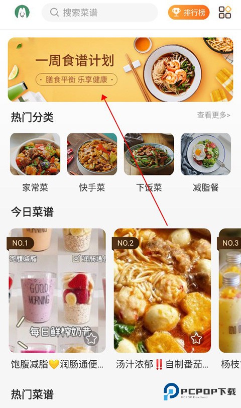 1、用户在首页可以点击最上方的“一周食谱计划”,即可进入食谱计划页面,开始自己的计划。
