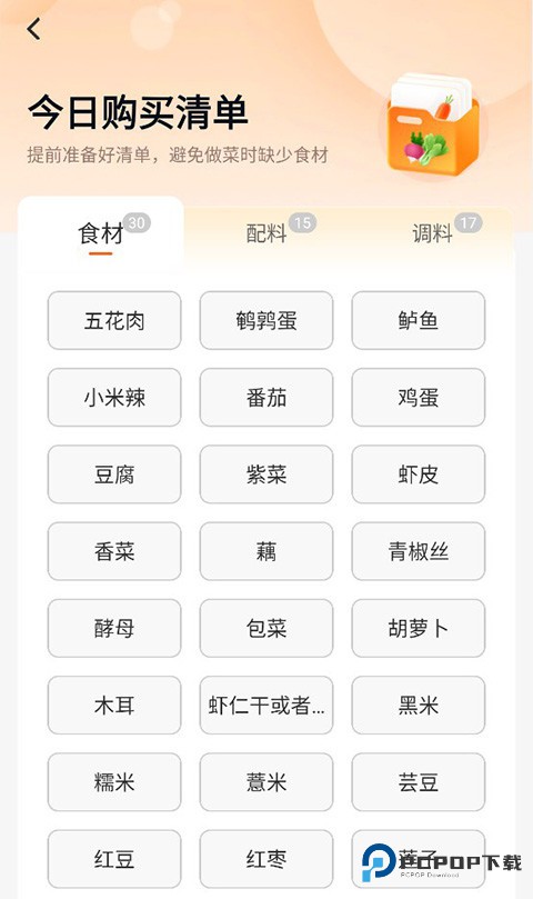 4、在添加完菜谱之后就可以点击右上方的“购物车”图标,进入食材清单,购买今日菜谱所需的食材。