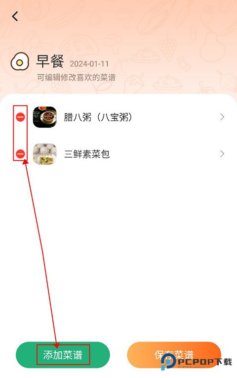 3、点击左下角的“添加菜谱”就可以进行菜品的添加啦,在添加之前可以点击上方的删除按钮将系统菜品给删除。