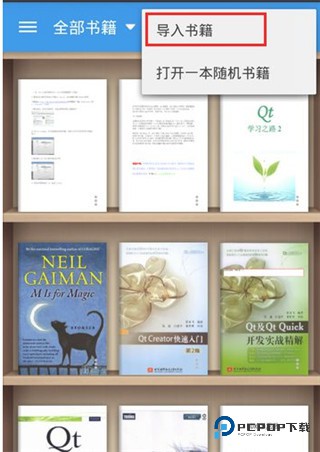 1、在书架主界面上,点击右上角的一排竖点(参见前面的两个图),然后在弹出的菜单中选择“导入书籍”(见下图)。