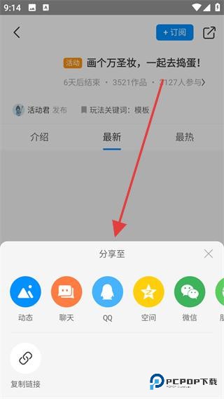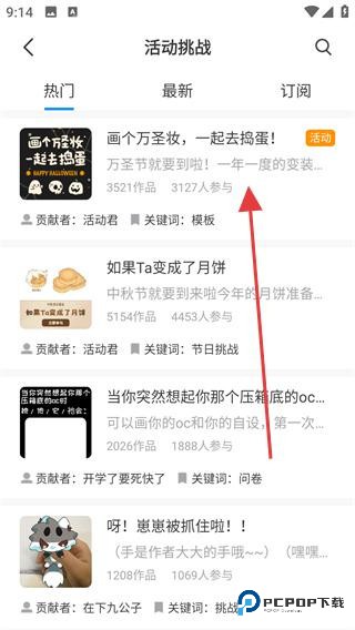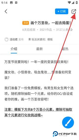 1、进入软件活动挑战页面,浏览热门、最新、订阅分类下的活动,选择画个万圣妆,一起去捣蛋活动,进入活动详情页。