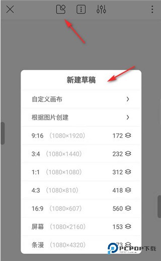 3、接着在“新建草稿”界面中选择画笔的大小,可以选择既定的尺寸,也可以自定义尺寸,如下图所示,同时,在上方的工具栏中有些常用的命令可以使用。