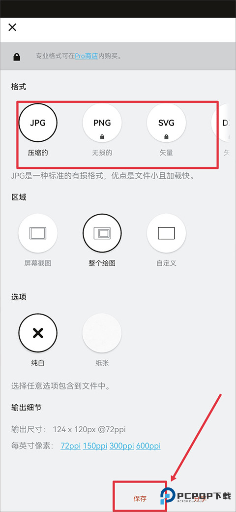 9、然后在导出界面中选择你要导出的格式,并点击保存就可以将绘画完成的作品导出到手机内啦