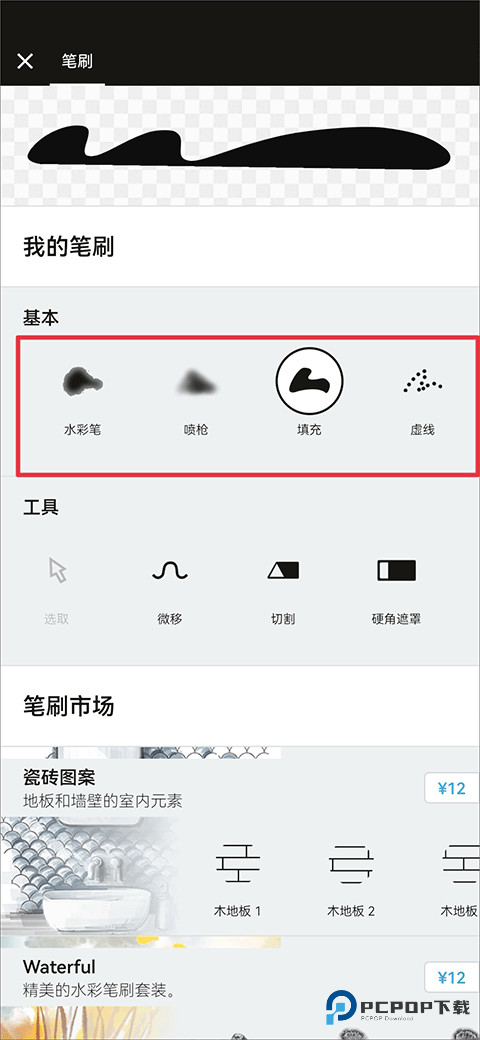 2、颜色选取后再次点击填充功能进入笔刷界面,并选择你喜欢的刷进行填充,选择不同的笔刷填充的方式也会不同