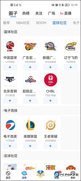 2、在动态中点击圈子可以看到一些关于nba中的热门话题,同时还提供了许多社区,例如篮球社区、电子竞技、足球社区等等。