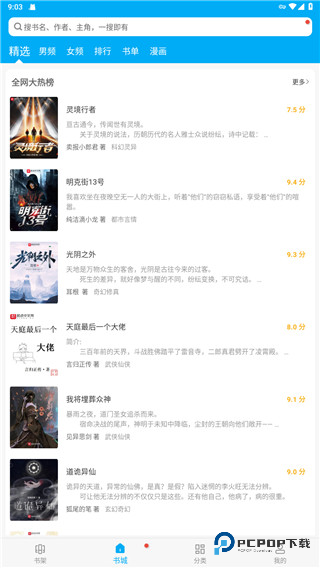 1、在笔趣阁app内打开书城即可查看精选、男频、女频、排行、书单、漫画等不同分类的小说和漫画资源;