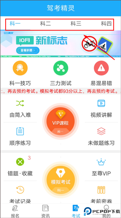 2、根据用户的学习进度来进行:科目一、科目二、科目三、科目四来进行学习,和模拟考试