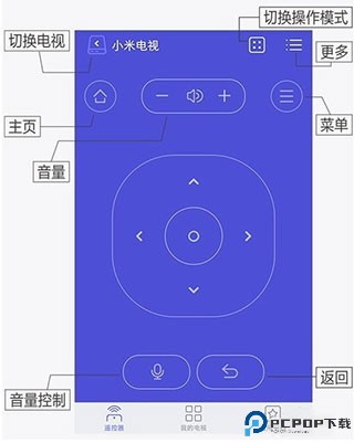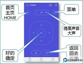 3、点击“小米电视(192.168.1.37)”,可以看到悟空遥控的主界面,非常简洁。常见的选择键、确定键、菜单键、主页键、返回键、音量键。下方是功能选择栏。右上方分别是切换手势遥控器和更多设置按钮