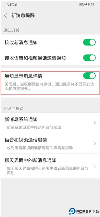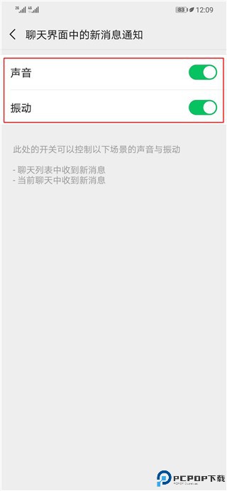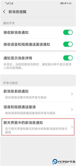 4、可根据自己的需求选择提示的项目,例如【聊天界面中的新消息通知】开启【声音】和【振动】提醒;