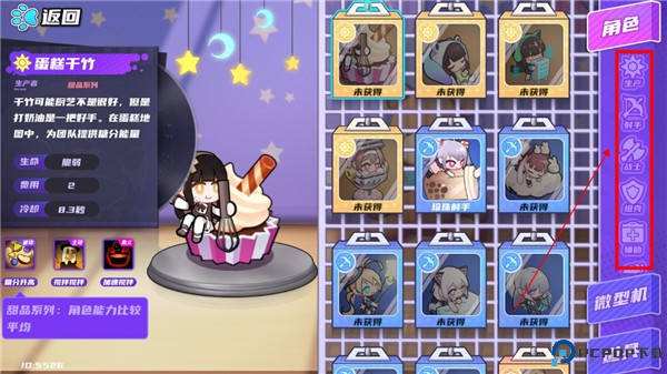 1、游戏中有着众多可爱的角色,其中分为六个种类,生产、射手、战士、坦克、辅助、特殊。