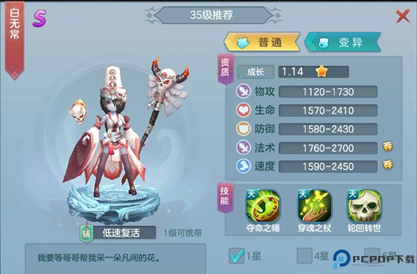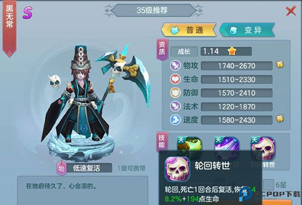 3、第三个黑无常,为什么说这个呢,因为除了,小龙女,猪八戒,这俩SS,别的前期想抽SS除了10连得花钱的,平民想抽只能用元宝一次一次抽,那就是看脸的了……毕竟前期你不能用系统送的A吧,而且游戏元宝很好赚的,黑无常有一个技能很不错,就是轮回转世,死亡一回合后复活,也算是一个不错的技能了!