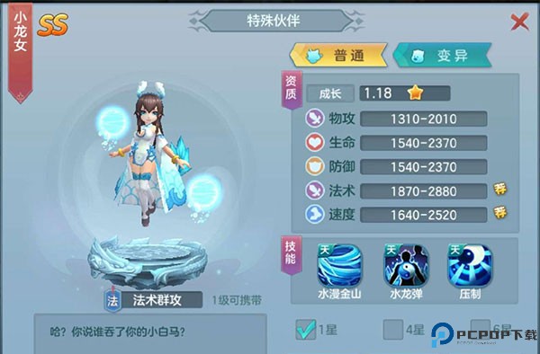 1、先给大家说一下小龙女,这个是通过一个首冲礼包获得,很划算的才6元,关键是还送你5元代金卷,所以你只需要花1元就好啦,这个小龙女非常强力,技能是群攻的,一个是随机3个目标还一个压制可以对眩晕的角色额外造成4.5的伤害,所以这个是所有玩家前期的必备角色!