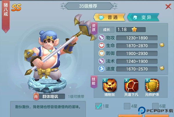 2、第二个猪八戒,登录第二天就送,第一天的时候我会用别的,比如判官,这个就不错,要不是第二天送猪八戒,也许我就用判官了,猪八戒是一个前排肉盾的角色,他的技能会给友方前排加一个护盾,还有一个会提高友方前控%70,他的另一个技能就是嘲讽,这样就有几率让别人攻击他了,很牛得肉盾!