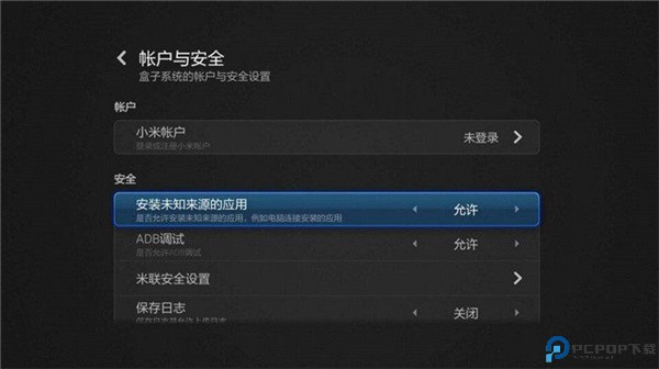 第二步:进入小米电视【设置】-【账户安全】-【安装未知来源应用】-设置为【允许】