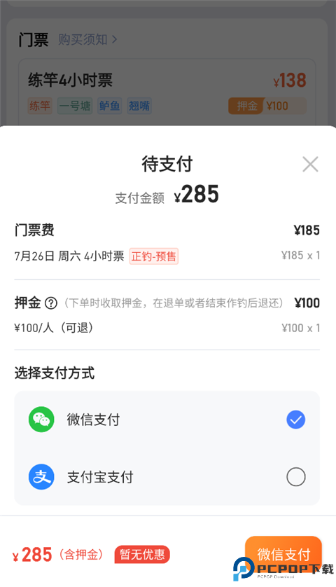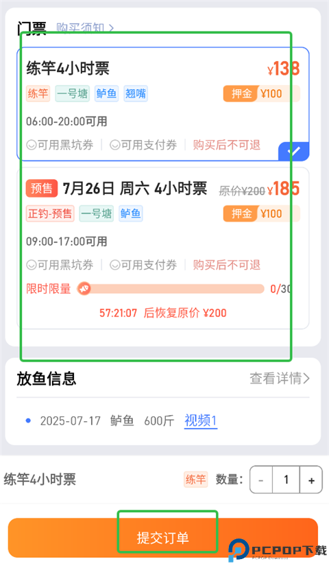 4、在钓点页面搜索到钓点后,进入购买界面,选择门票,点击提交订单。