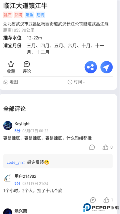 3、选择钓点进入,查看详细位置、推荐水位以及其他钓友的评价。