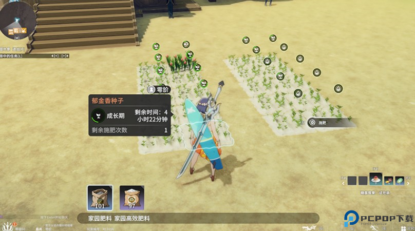 在「田地」中播种后,冒险者可浇水、施肥加速花卉生长,通过授粉改变花卉性状,从而收获不同品种的成熟花朵。
