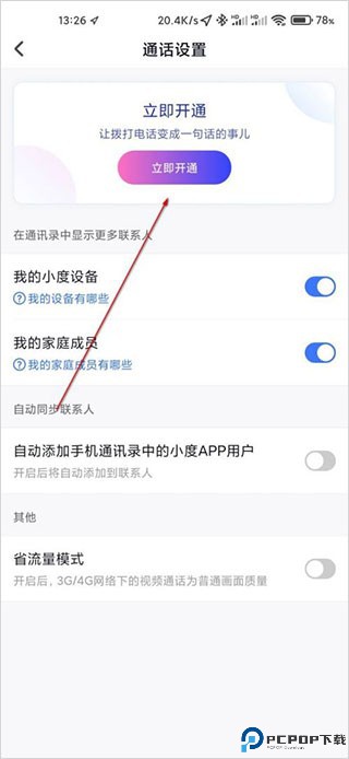 1、打开小度app软件进入首页,点击进入小度通话;2、然后点击按钮,打开设置;3、最后点击按钮,立即开通即可。