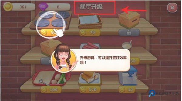 5、可通过餐厅升级功能消耗金币提升设施。例如解锁【煎饼锅】可提高食物制作效率,升级【煎饼油纸】则可增加同时容纳的食物数量。